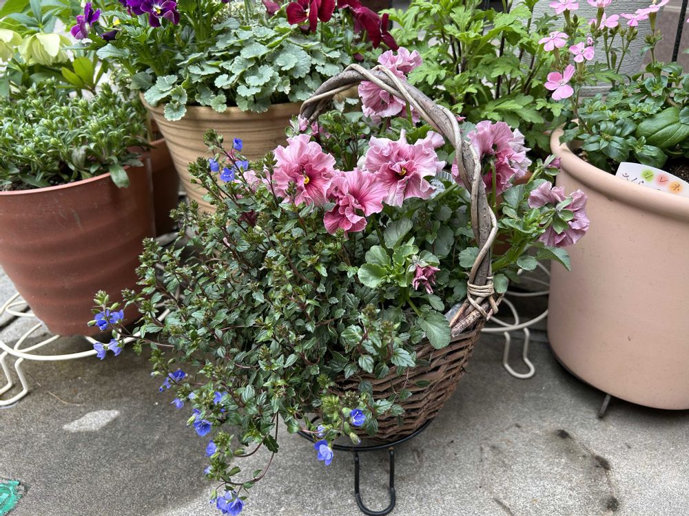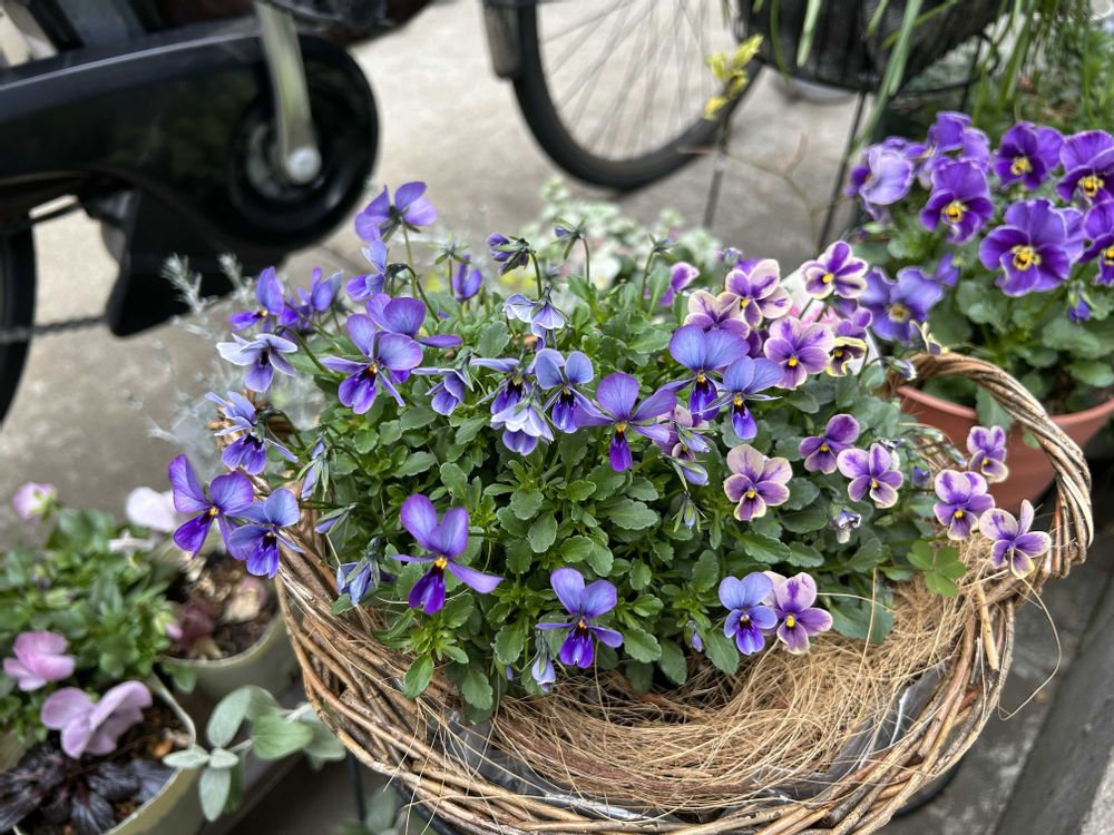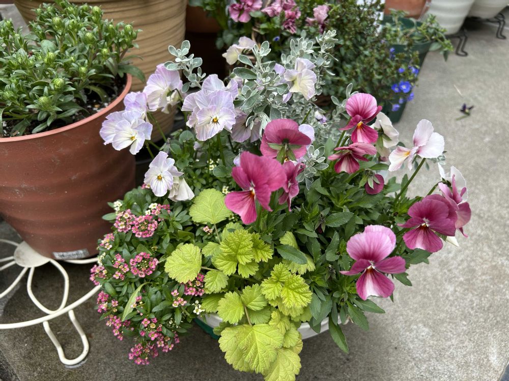 ①ときめきビオラひらひら蝶々とブルーミングピンクの寄せ植え