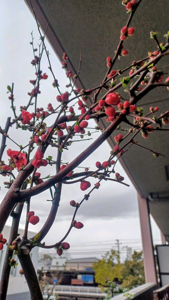 落着して安堵したあっちゃんの気持ちを表すかのような、スッキリと枝を伸ばしたボケのお花、可愛い赤です。コロンとしてね。♥️♥️♥️