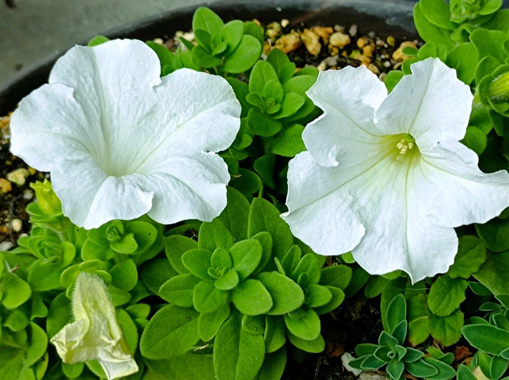 真っ白なペチュニア、冬越し出来て良かったですね🤗