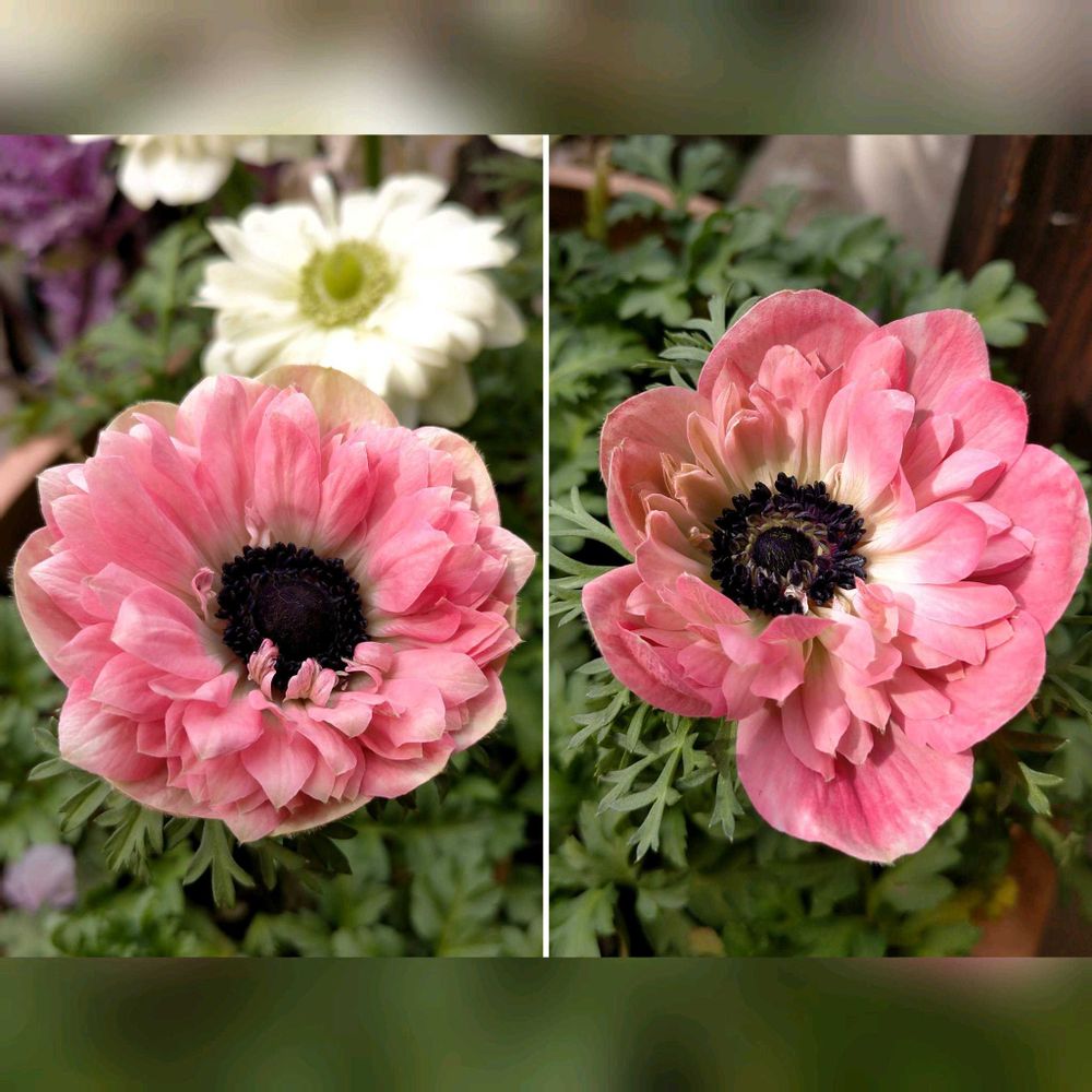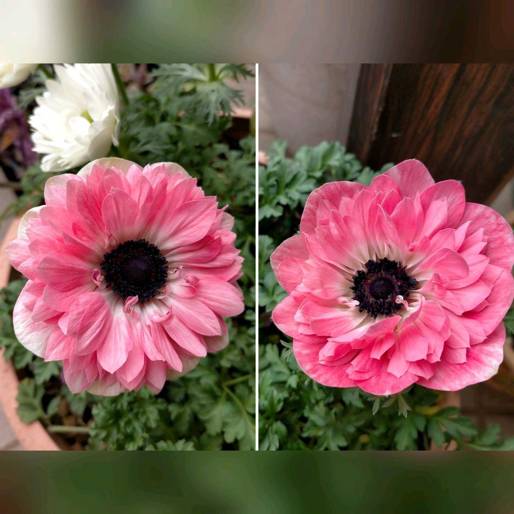 【1枚目】3月12日に投稿した八重アネモネの蕾が開き、ベージュピンクっぽかった蕾はこんなに派手なピンクになりました。まぁ可愛いピンクちゃんなんですけどね☺️