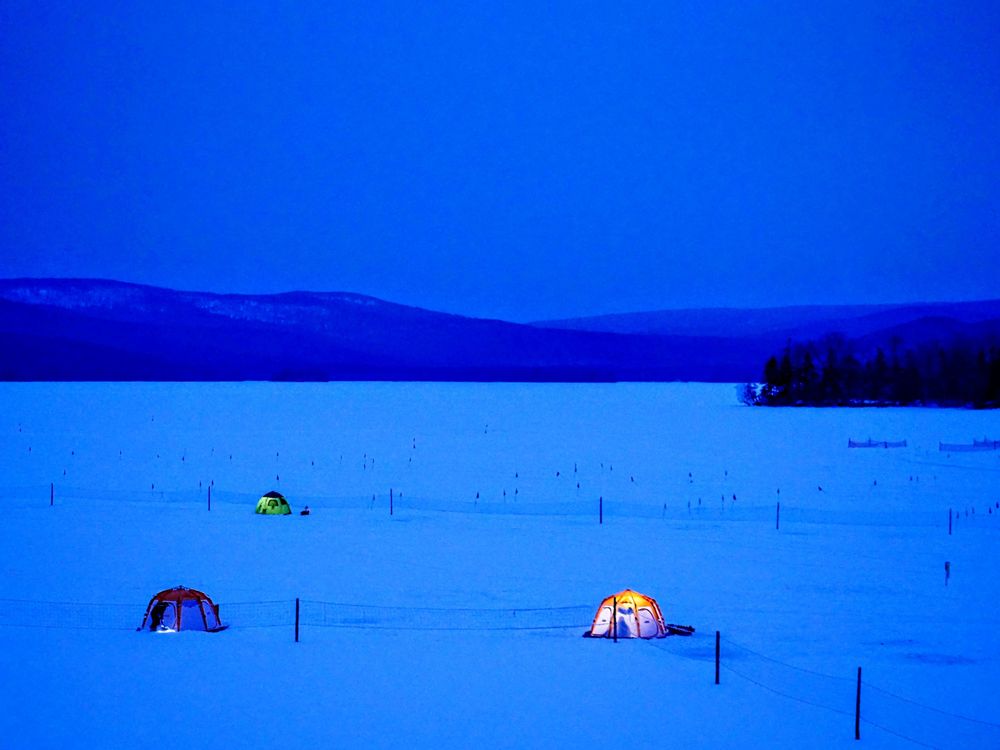 翌朝夜明け前から、ワカサギ釣りのテントが並び、これを横目に私はボッケ(アイヌ語で煮え立つ)に向かいます。湖上をちょっと歩き、遊歩道?雪上の足跡を頼りに歩いたが、途中新雪を踏んで腰まで雪の中に落ちてしまった。😂