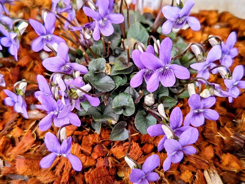 今日のお花🏷️の、スミレ。いつもの公園、入り口展示の黒葉スミレ📛。ちょうど今、沢山の花を咲かせています。マルチングのウッドチップが•••やけに赤い😅