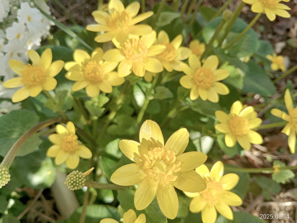 ヒメリュウキンカがあちらこちらと、全く違う場所でも咲き出しました。これは親株ですが、増えると嬉しいです(⌒_⌒)🌼マルこい葉っぱが可愛い🟢半日陰でも育ちますから楽ですね✨