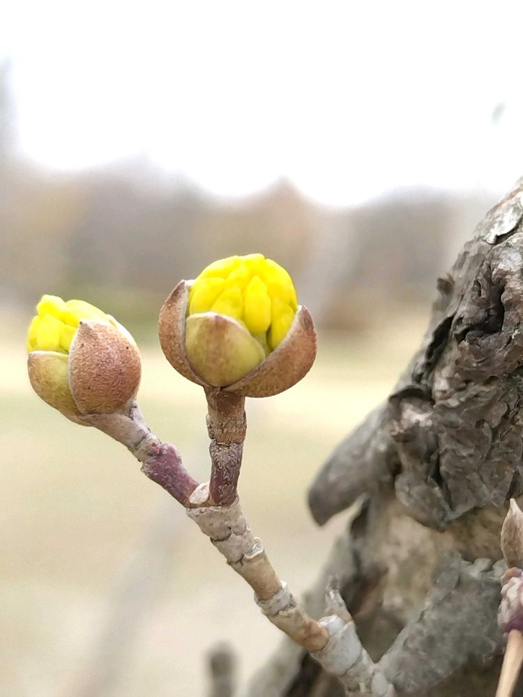 七北田公園ではマンサクの後にサンシュユが咲き始めました。
