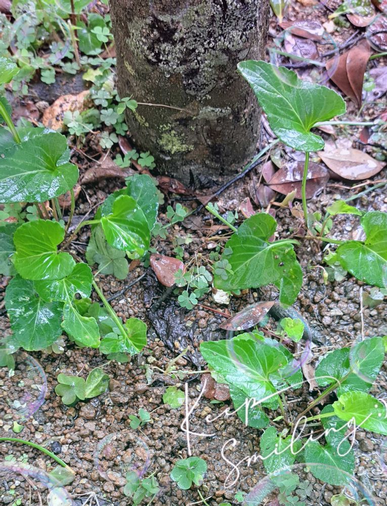 紫の花を探して庭を歩くも咲いてなく 辛うじて木の株元に 3株の根を見つける🌿🌿