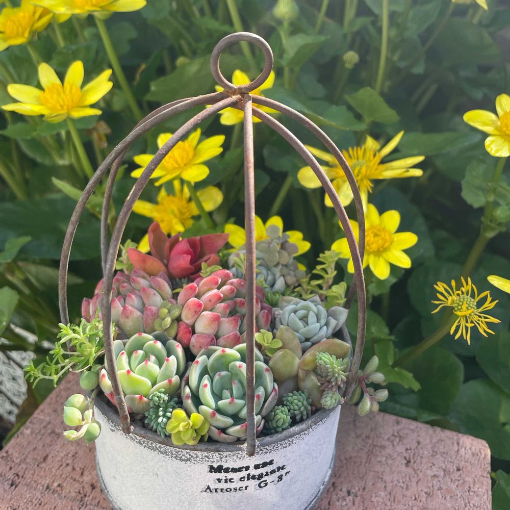 可愛い鳥かご鉢?にコロンとした多肉さんの寄せ植えが素敵だね~٩(๑ᵒ̴̶̷͈᷄ᗨᵒ̴̶̷͈᷅)و♪💕