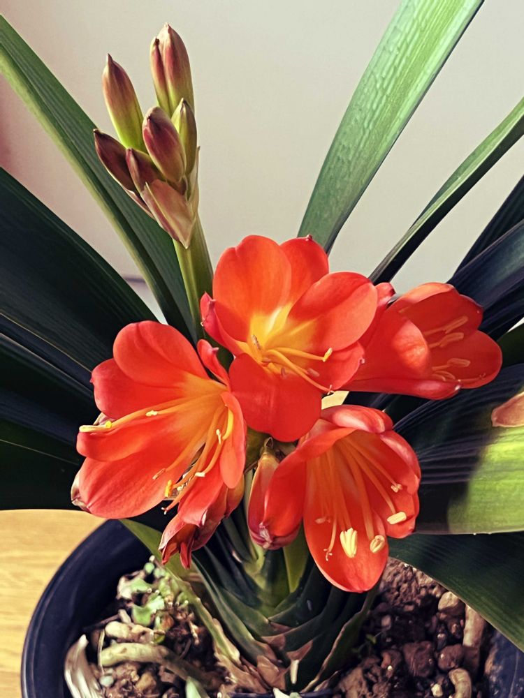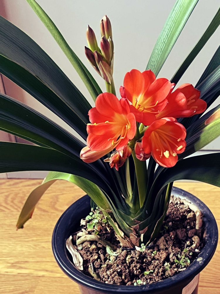 蕾だった君子蘭が咲いていたので、慌ててリビングに連れて来ました。