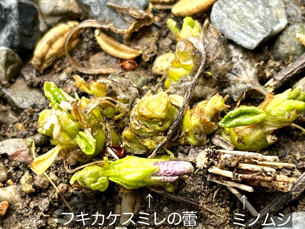 フキカケスミレの蕾が確認できます。葉っぱもないのに先に蕾?🤔 2〜3年目の株のようで、暖かくなって芽が出てきたようです。