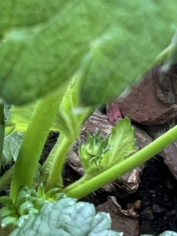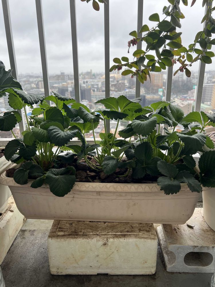 プランターのいちご。蕾が咲きそうなのと、茎を伸ばす途中なもの、ペースはそれぞれ。