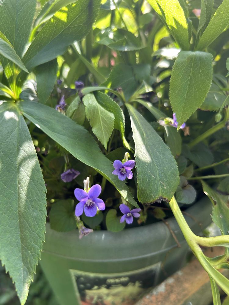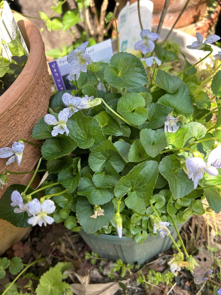4枚目🤳は宿根ビオラ ラブラドリカです。冬は黒葉ですが、4月だと葉は緑になっています。