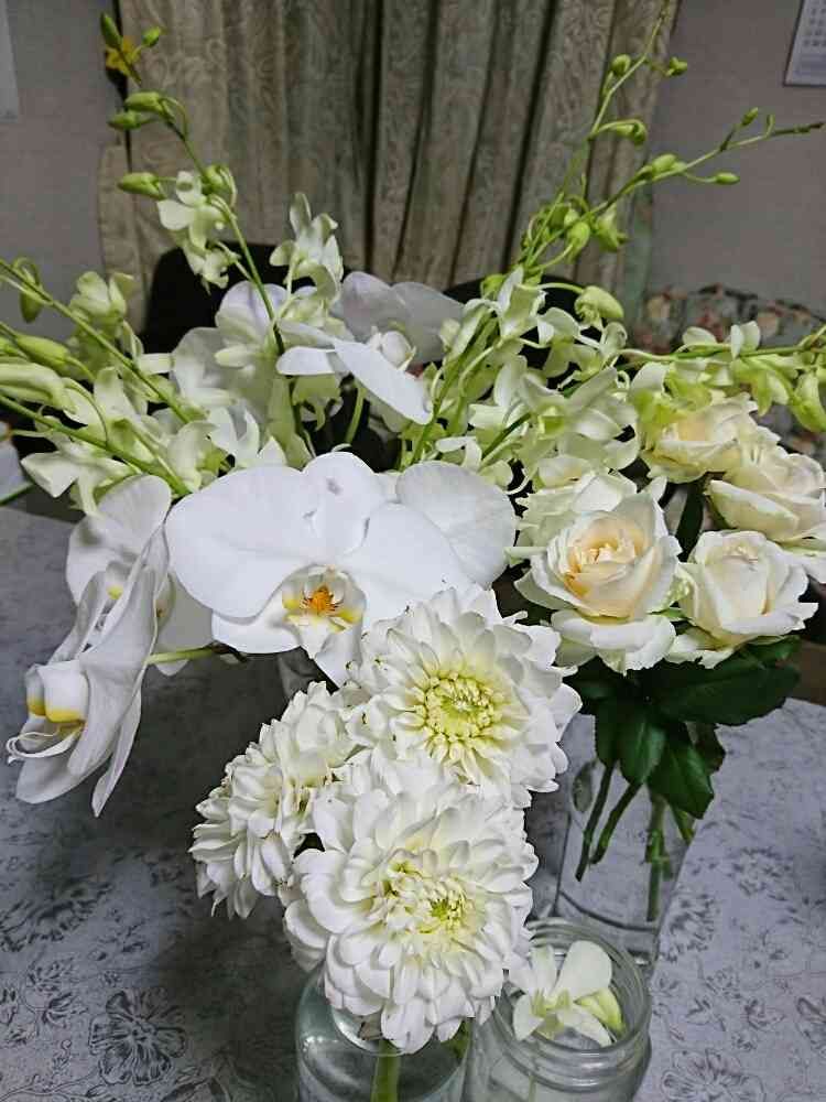 白のダリアも素敵だし、白バラの中心は、ホンノリとクリーム色の素敵なバラです。