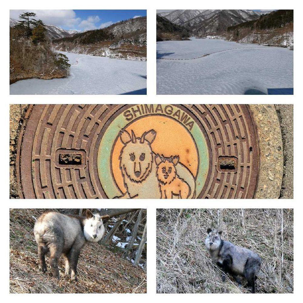 2枚目は四万ブルー💚の湖を期待して行った奥四万湖の予想外の雪景色🏔❄💙と偶然出会えた天然記念野生動物ニホンカモシカの親子🐐🐐です🤩✨