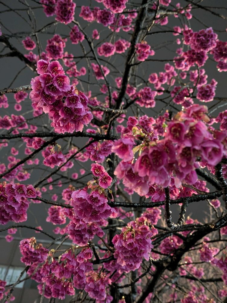 下向きの濃いピンクなので、緋寒桜(ヒカンザクラ)だと思います。🌸🌸🌸