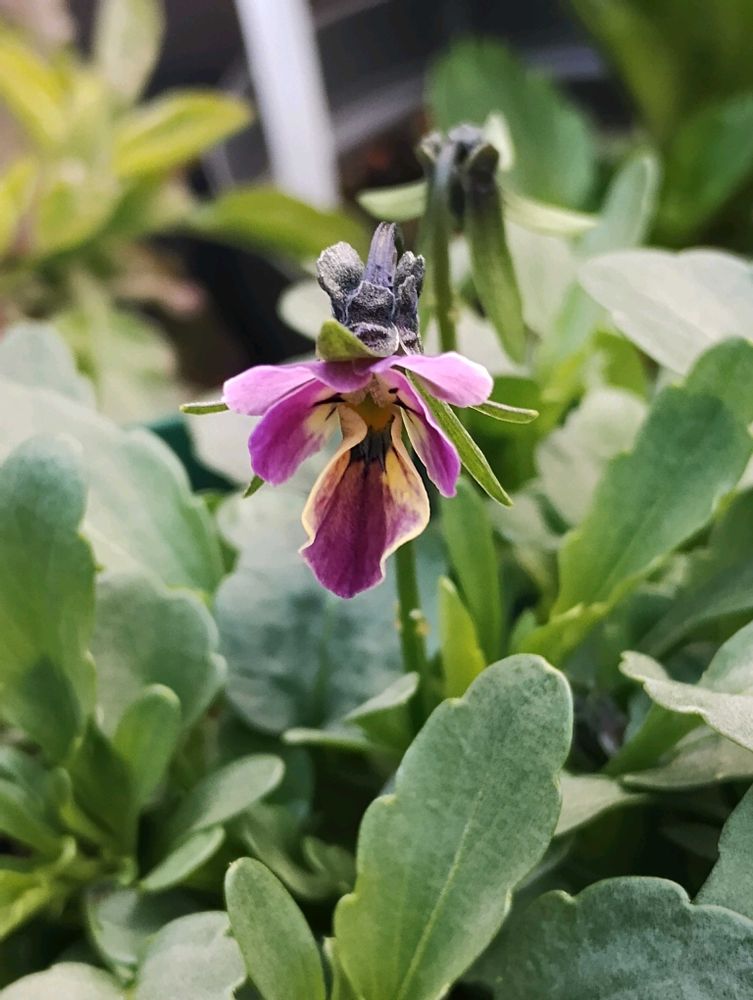種まきビオラ、半年かかってやっと咲いた一番花はこのコです♪、、、が、これ「売り物にならんやつ」かな😅