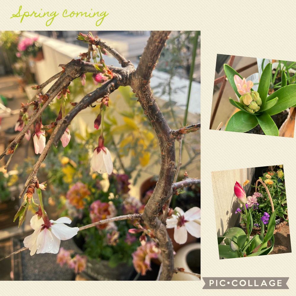 富士山のお土産の枝垂れ桜に少しずつお花がつき始めました。