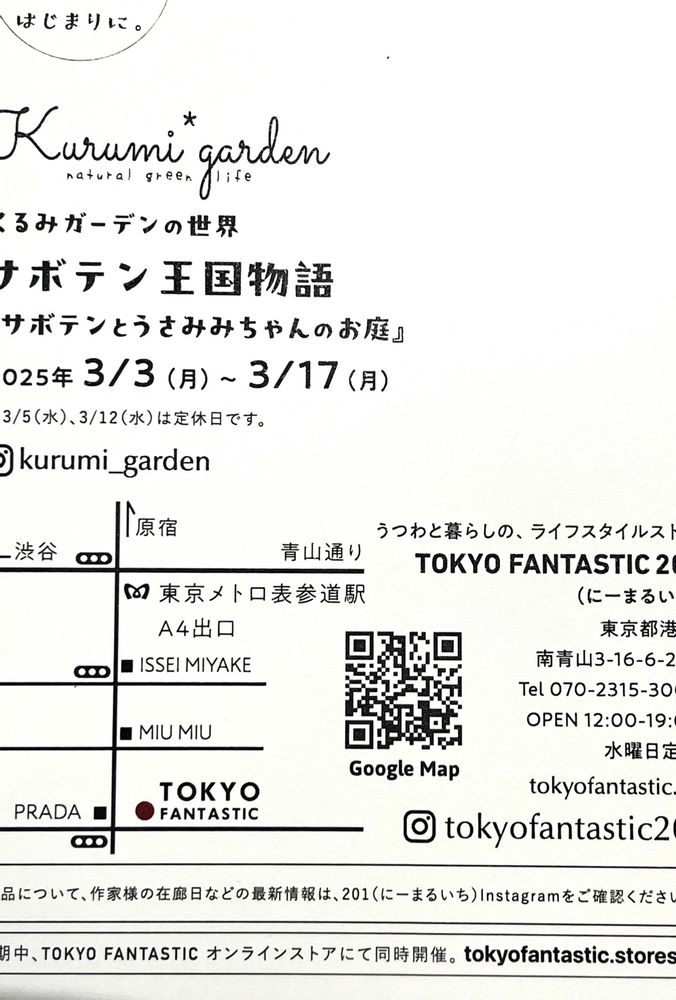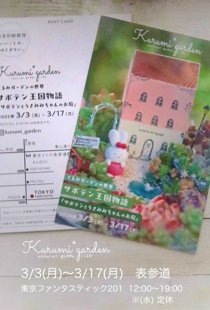 ▷12/13〜25 横浜駅 合同展 Hideharu Fukasaku Art Museum (横浜市神奈川区鶴屋町3-33-2 横浜鶴屋町ビル1F) ▷くるみガーデンミュージアムin横浜 (JR京浜東北線 根岸駅) ※入場料1000円でお茶とお菓子付き 植物や作品の見学、お買い物やワークショップもできます。 完全予約制(住所非公開) ※InstagramのDM、くるみガーデンのメール(kurumi_garden@outlook.jp)からミュージアムの予約出来ます ※定員1〜4名まで ワークショップ(材料費込) サボテン手のひらガーデン4000~ Mサイズの鉢の寄せ植え 6000〜 Lサイズの鉢の寄せ植え 10000〜 多肉植物箱庭、ガラスジオラマ、積み木のアイテム作り 🔴2024.4 フジテレビ めざましテレビ 『キラビト』出演 📕出版書籍 主婦の友社より 『多肉植物とドライフラワーのミニチュアガーデン』(第3刷) くるみガーデン くるみ* ※くるみガーデン•オンラインショップではサイン本の購入ができ、オリジナルしおり🔖のオマケ付き❣️ 🔴YouTube 、X(Twitter)、Instagramやってます 登録してもらえると嬉しいです😊 🔴『くるみガーデン』オンラインショップでは、サボテン、用土、お家、小物、ピック、寄せ植え、など購入できます 🔴Instagram、on-lineShop、WS ↓↓↓↓↓↓↓↓↓