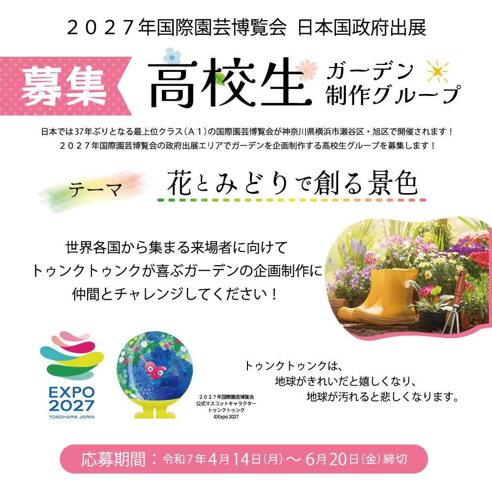 農林水産省では、2027年国際園芸博覧会の開催国政府として魅力的な出展を実施するための準備を行っており、政府出展エリアでガーデンを企画制作する高校生グループの募集に向けて、公募要領を公開いたしました。