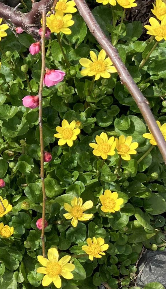ヒメリュウキンカとウメ。ポカポカお日様に照らされてたピンクと黄色の花は仲の良い友達のようです。そんな風景を見ると不思議と嬉しくなりました☺️素敵な一日になりますように🤲
