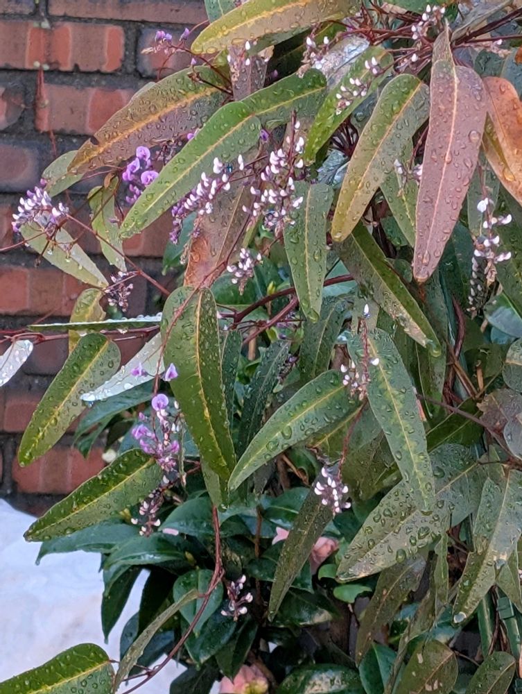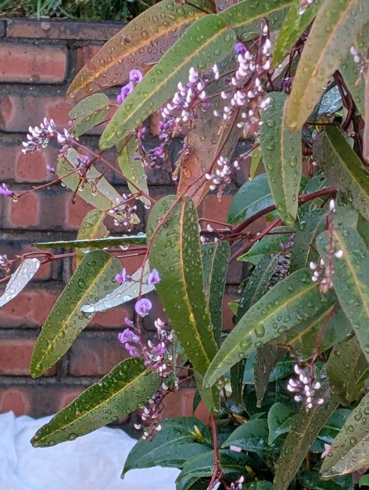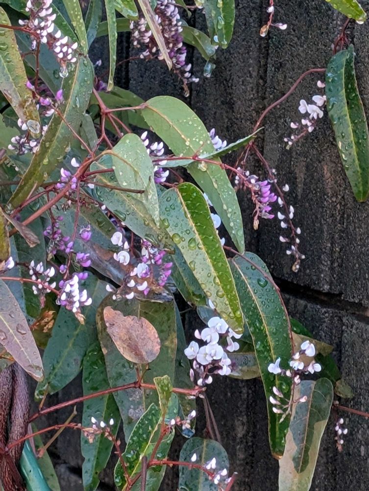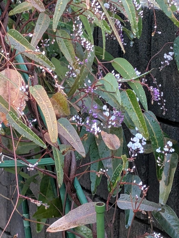 私の自宅では、ハーデンベルギアの、紫と、白が、今、盛りで、咲いています、生垣や、ポポラスの木に、絡みついて、綺麗です😍丈夫で、葉っぱは、1年中青々としてます、😃