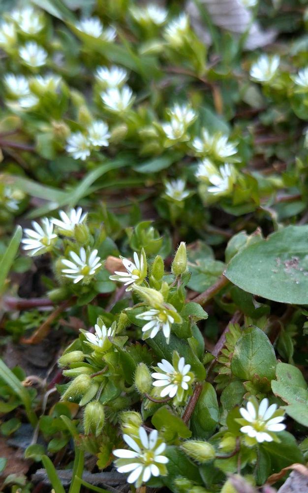 ナデシコ科ハコベ属の2年草。1922年に東京で確認されたヨーロッパ原産の帰化植物。畑地、道端、空き地など日当たりの良い場所に生え、ほぼ1年中生育する。よく似た在来種の繁縷(ハコベ 別名ミドリハコベ)より圧倒的に多い。コハコベがハコベと区別されたのは大正時代といわれ、2種を区別せずハコベと呼ぶ場合もある。1㎝に満たない小さな白い花の花弁は5本だが、2深裂するため10本に見える。雌しべの花柱は3本で、よく似た牛繁縷(ウシハコベ)は5本。蚤の衾(ノミノフスマ)は萼片より花弁が著しく大きいので正面から見ると萼片が見えない。