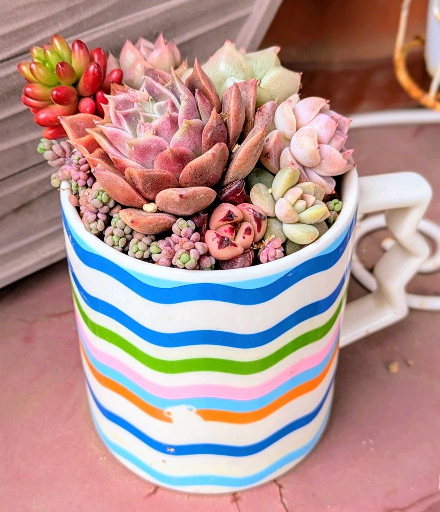 主人が使っていたマグカップの口が欠けてしまったので、底穴を開けて多肉さんを寄せ植えしました(笑)