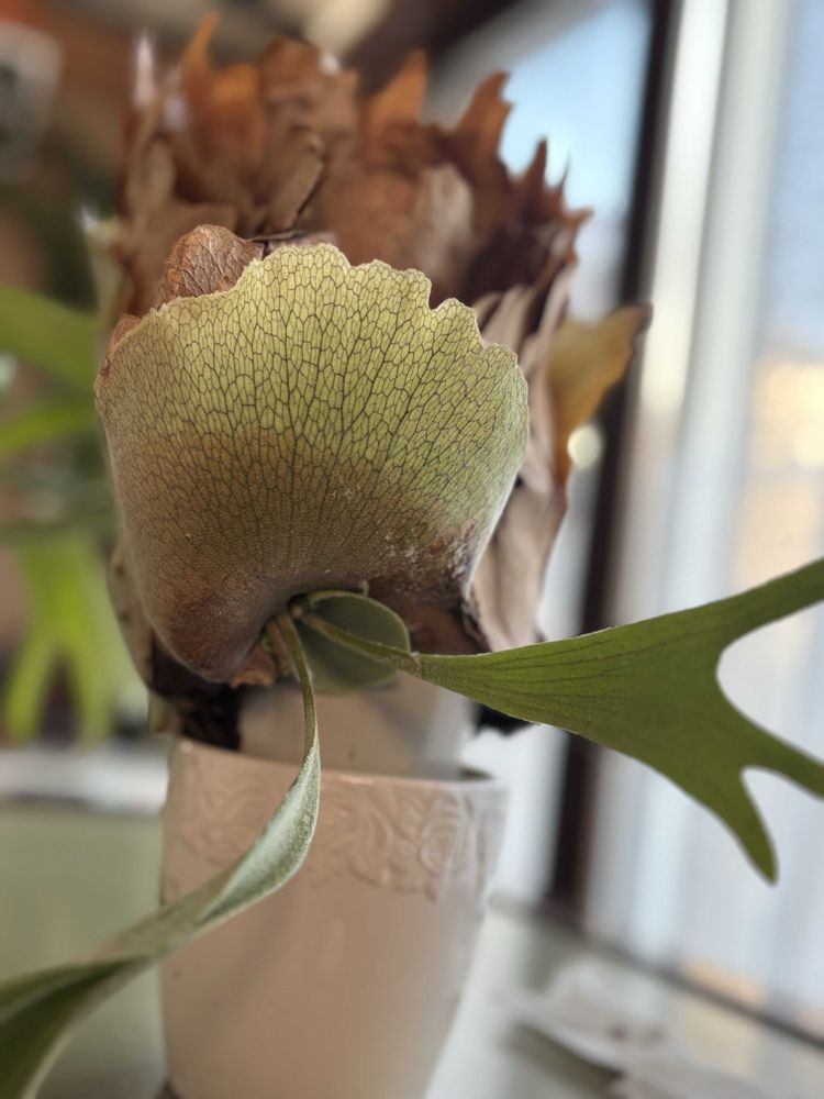我が家のビカクシダは、小さな鉢に貯水葉を絡めて成長してます。
