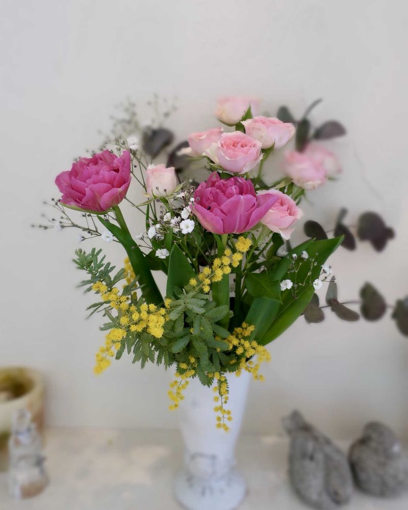 ピンクのチューリップ🌷とミモザが入って春らしいウェルカムフラワーですね💐