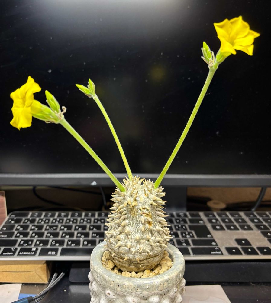 パキポディウム デンシカウレ(恵比寿大黒)が黄色くかわいい花を咲かせました。