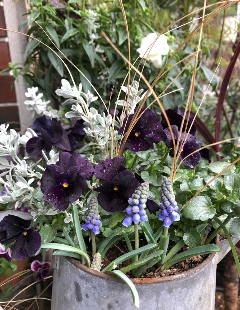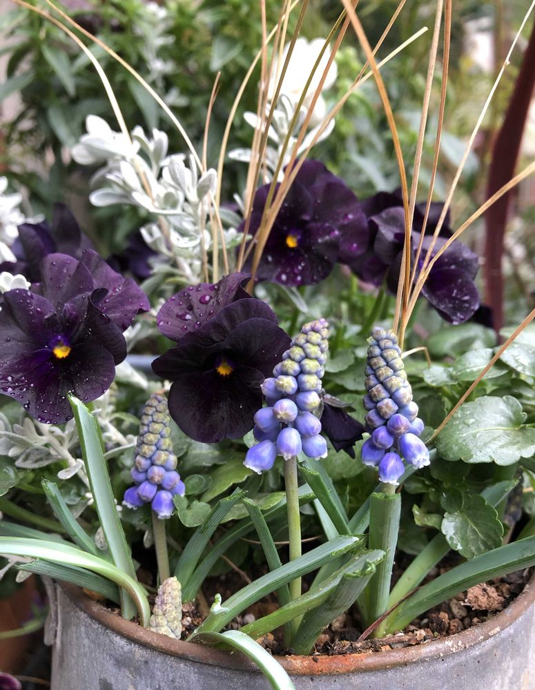 黒ビオラの寄せ植え🪴に仕込んでおいたムスカリが、咲き始めました♡