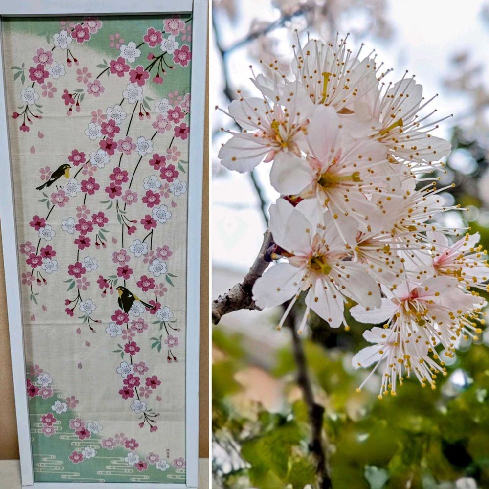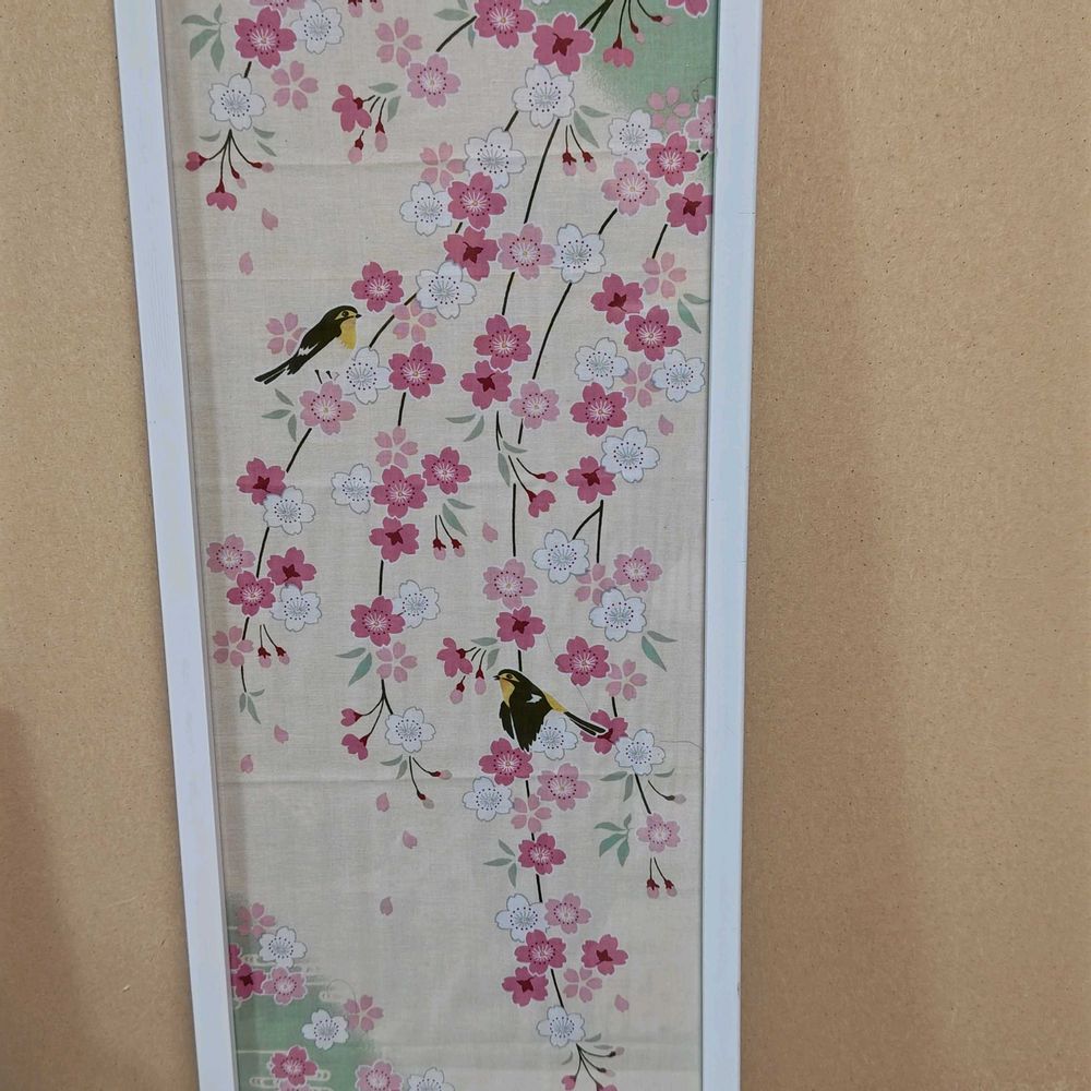 額の中の絵手ぬぐいも、椿⇒桜に交換。濱文様の「しだれ夢桜」です。仲良く遊ぶ小鳥は、キビタキだそうです。