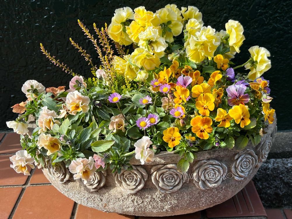 ①冬越ししたパンビオの寄せ植え。