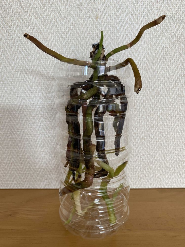 水苔に覆われていなかった部分はどす黒いけど中身は硬くしっかりしています。こちらも根腐れはありませんでした。どす黒い部分は切らずにこのままペットボトルに入れて様子みていきます