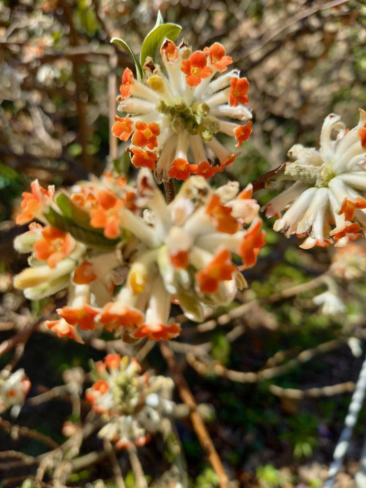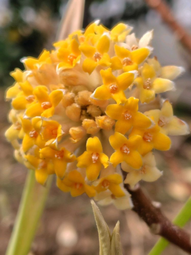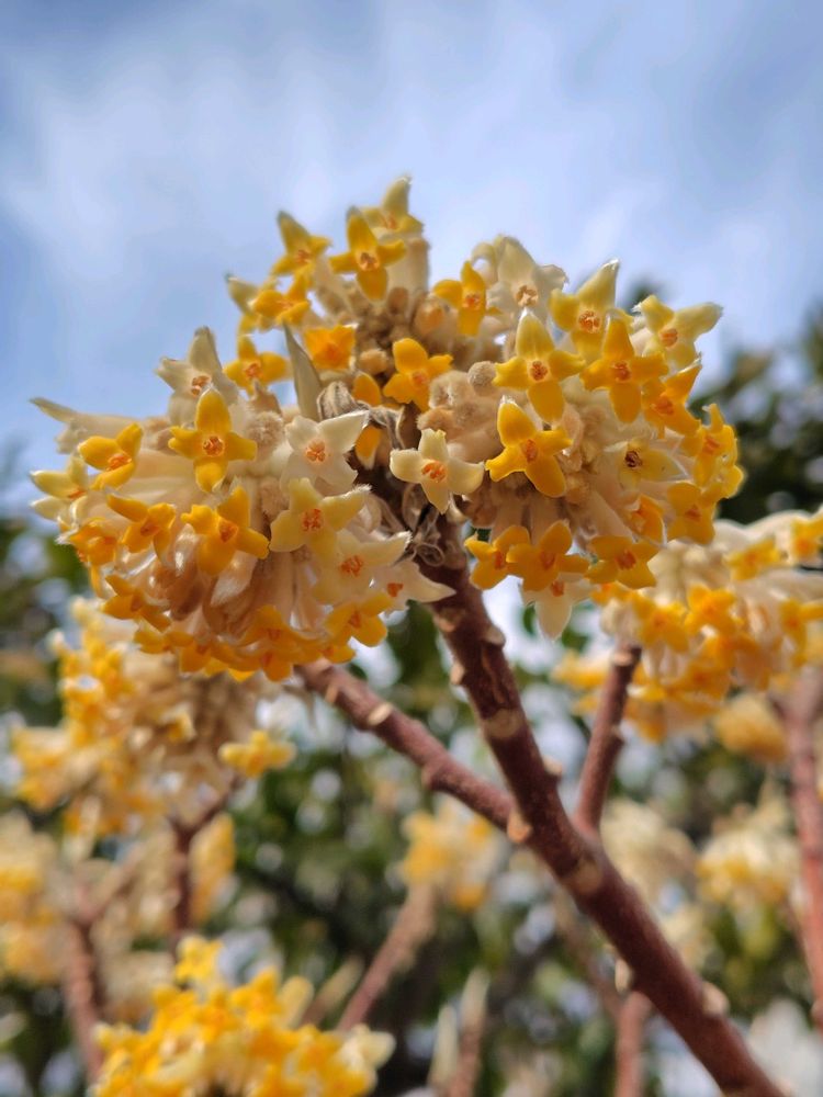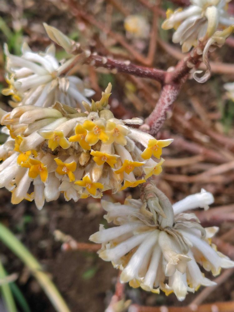 「下を向いて咲く花には芳香があり、小さな花が集まって半球形をつくっています。この小さな花には花弁はなく、花弁のように見えるのは筒状の萼の先端が4つに裂けて反り返ったものです。枝は3つに分枝し、これが「ミツマタ」の名前の由来となっています。強い繊維質の樹皮は、強度の高い良質の紙の原料として有名で、紙幣などにも使われています」(ネット情報〜)