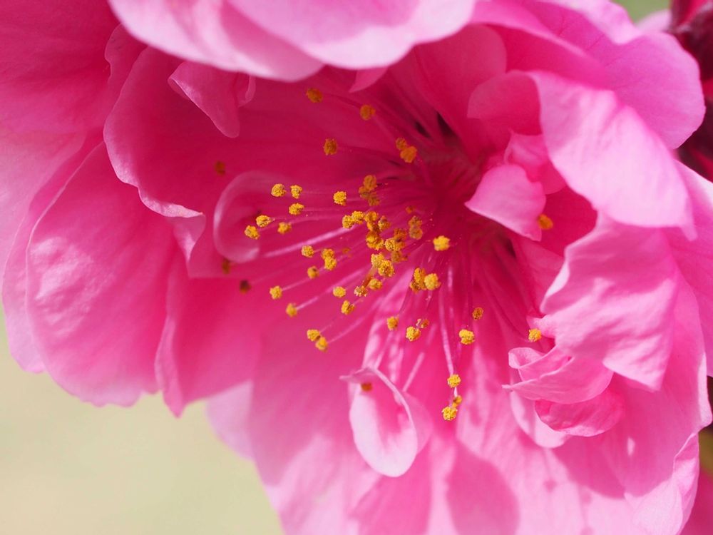ハナモモの濃いピンク色の華やぎが、春の歌声を奏でるようにして、元気をプレゼント✨🎁✨してくれる