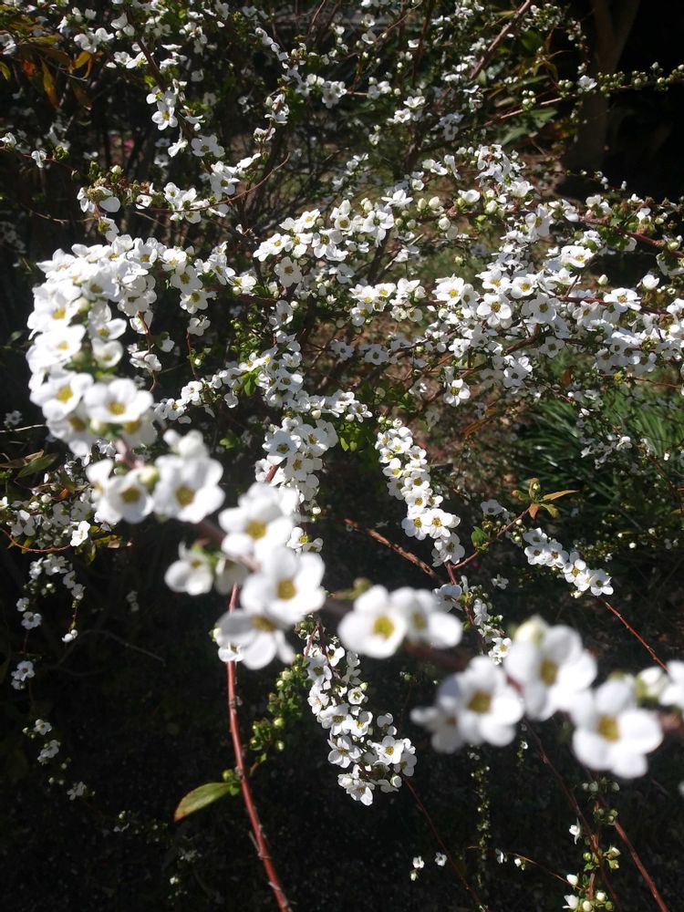 小さな花が集まって咲くので最盛期は遠目に白っぽくて分かります「ユキヤナギ(雪柳)」🥹