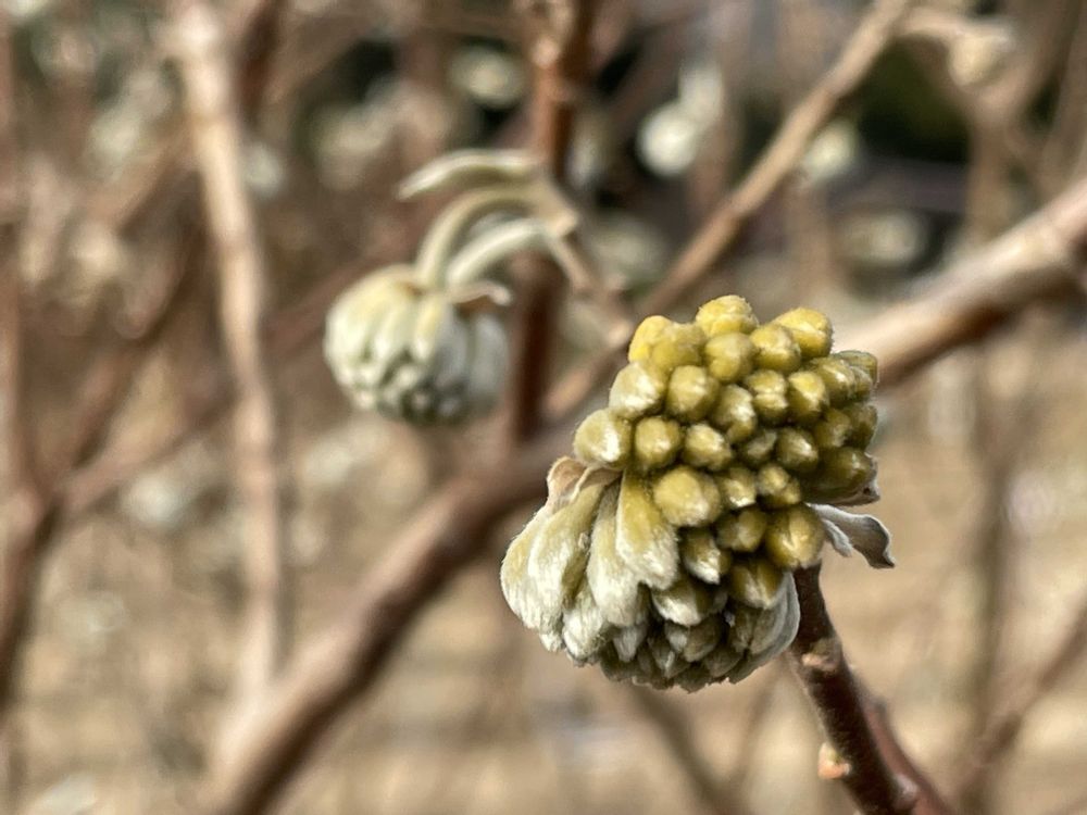 ②先月の小石川植物園にてまだ蕾のミツマタ