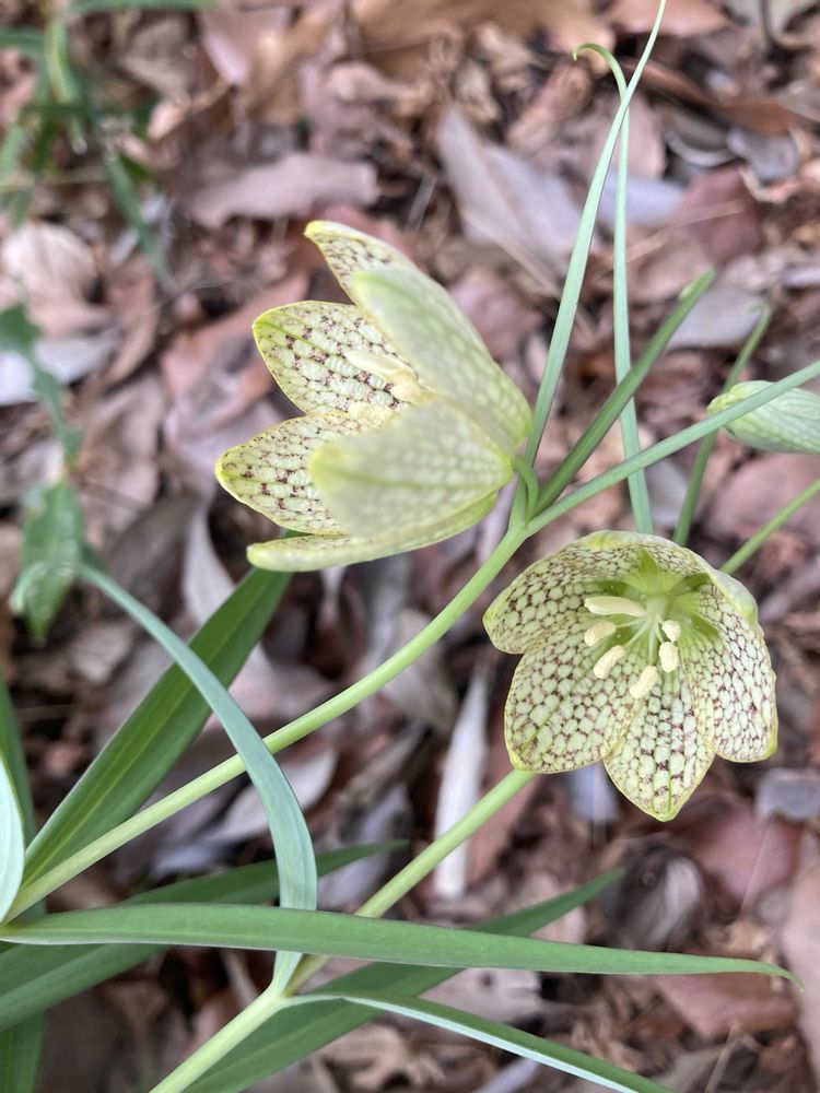 早いもうバイモ咲いてる-我が家は中々花芽が付かず🌿のみ地植えして3年今年こそはと期待して😍