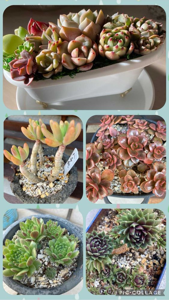 バスタブ🛁寄せ朝明るい所でみるとまた違いますね🎵八千代さんまた背が伸びてきた😅まぁコレはコレで良いかな🆗→メラコさんの葉挿し丼ツヤツヤで可愛い🩷↓はセンペルさん我が家はどちらも名無しですが、お気に入り☺️色づいてきました