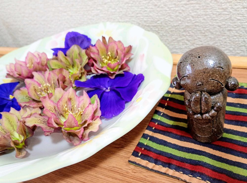 先日、輪島朝市で購入した『珠洲焼』の小さなお地蔵さんと、💮💮花遊び