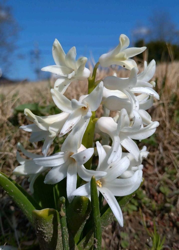 地下に径5㎝ほどの鱗茎をもつ球根植物。花期は3~4月。肉質の葉を出し、その中心から太い花茎を伸ばす。香りの良い花を総状花序につける。先の尖った花被片は反り返るように咲く。開花期間は長く、寒さにも強い。一重と八重の品種があって花色も豊富。花色は青紫色、ピンク色、紅色、白色、薄黄色。植えた鱗茎は母球として更新されずにそのまま残り、毎年肥大する。外側の紙質の外皮は花色と似た色をしており、球根から花色を推測することができる。室内で花を咲かせるには、凍らない程度の寒さにあわせてから部屋に入れる。