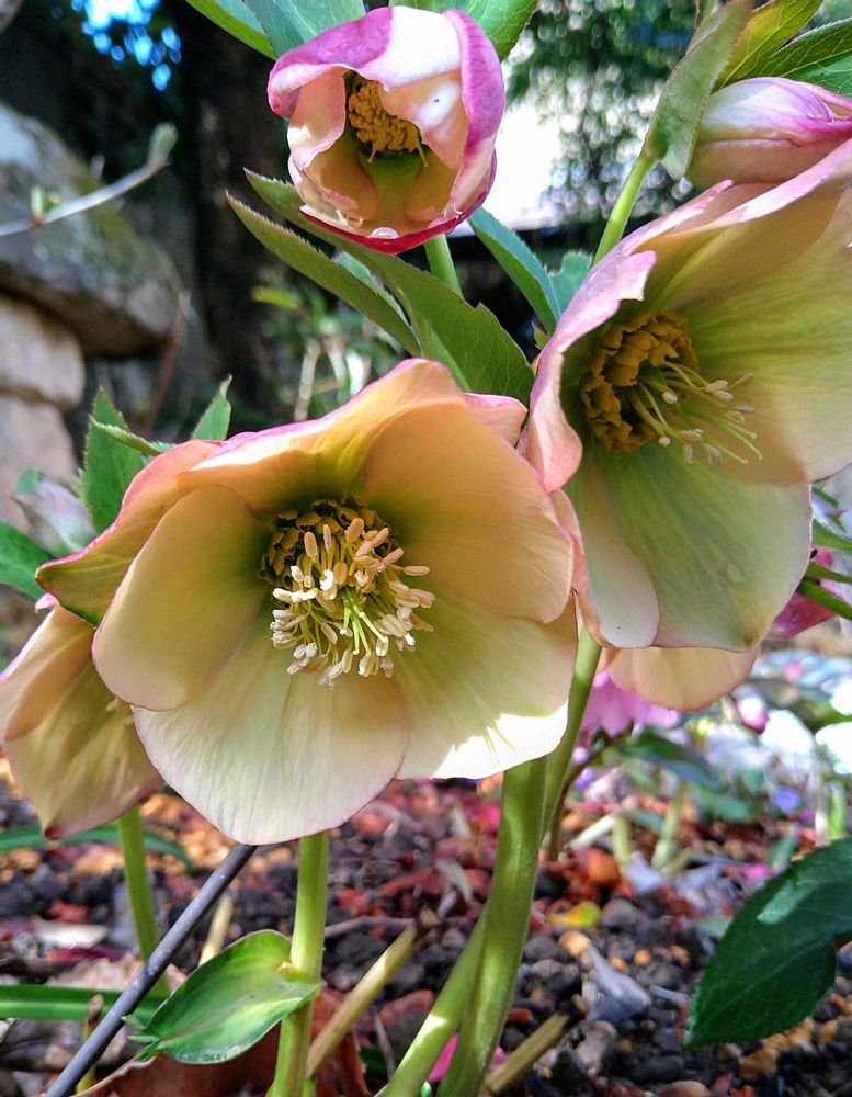 今は陽がさして、雨上がりのクリスマスローズたち✨🧡❤️🤍💜✨