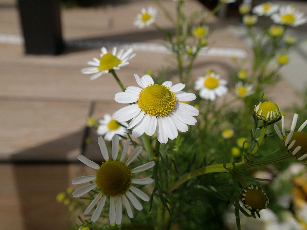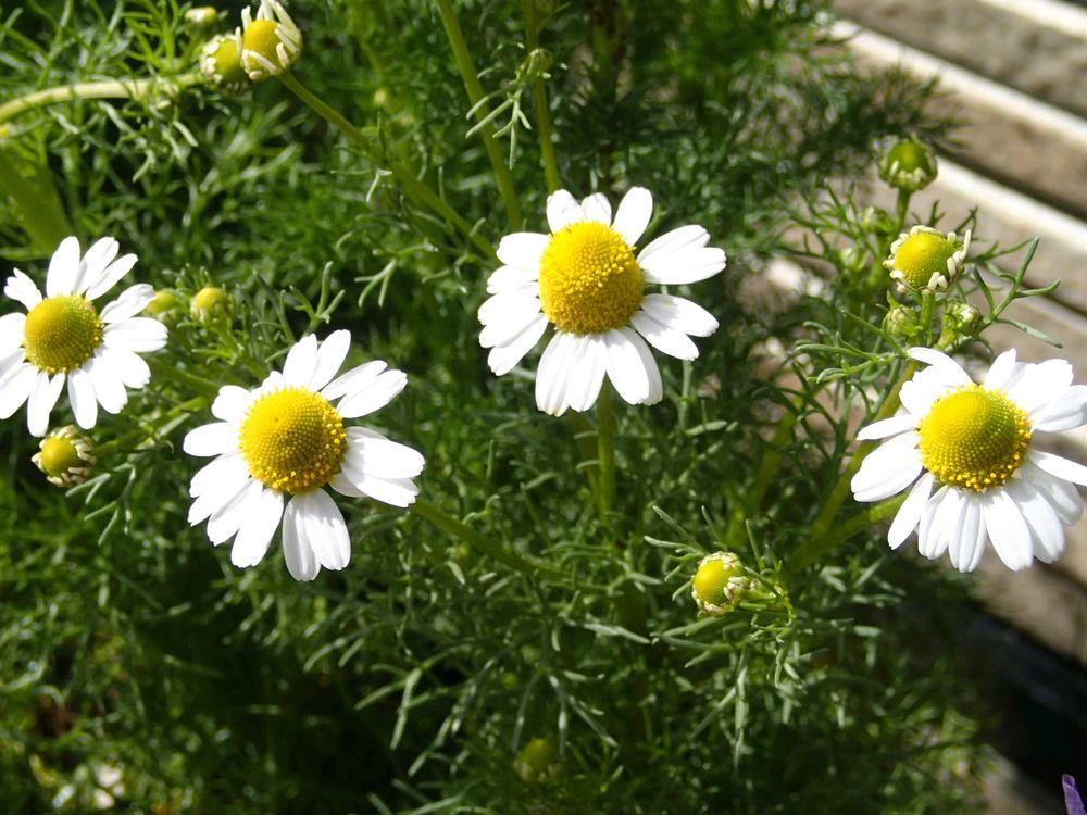 秋に芽が出ていたジャーマンカモミールが陽気に誘われて咲き出しました。💮🌼