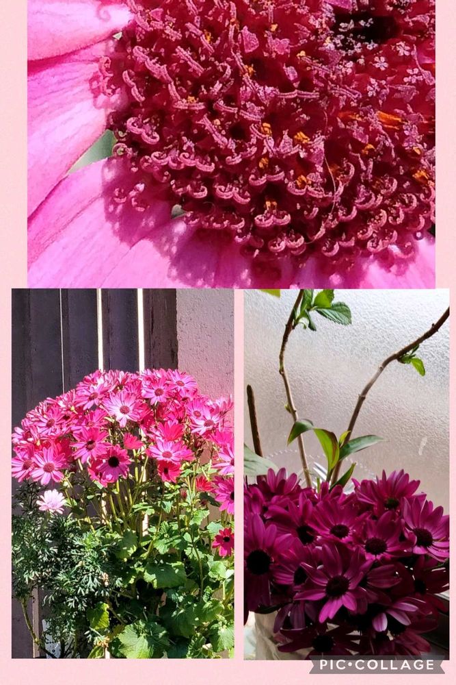 2枚目の上 ビジューマムカーネリアン(マーガレットとローダンセマムの交配だそう💖)1枚目の左下にもチラッと(^^)100円の特売😘