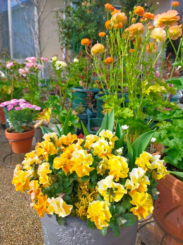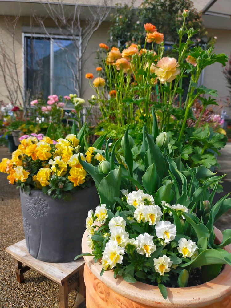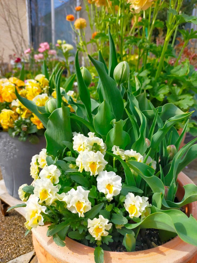 ①②花日和 さんのビオラ『ふわたま 』🍳と一緒に植えた、冷蔵チューリップは開花まで後少し🌷