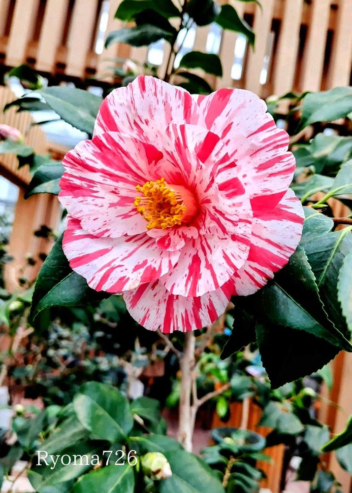 ②八重咲きの華やかな「太平の里」というツバキです。