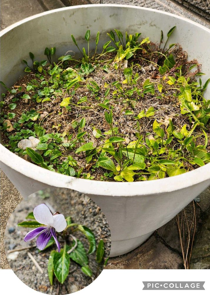 1️⃣家のすぐ近くの空き家の前に大きな鉢(高さ80×直径50㎝)にたくさんスミレの苗