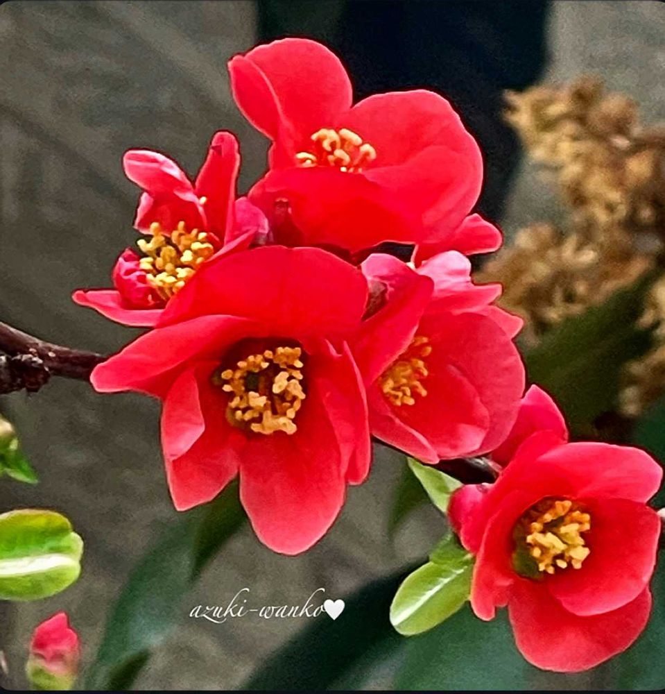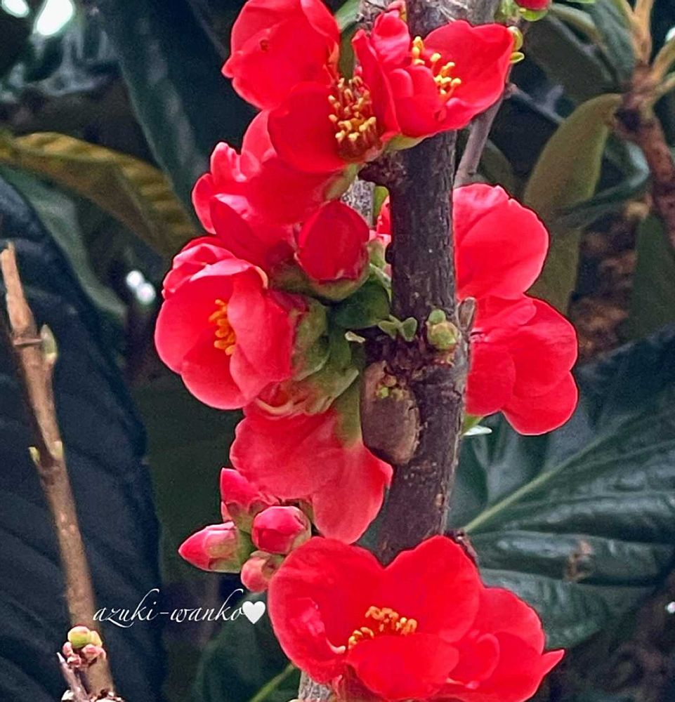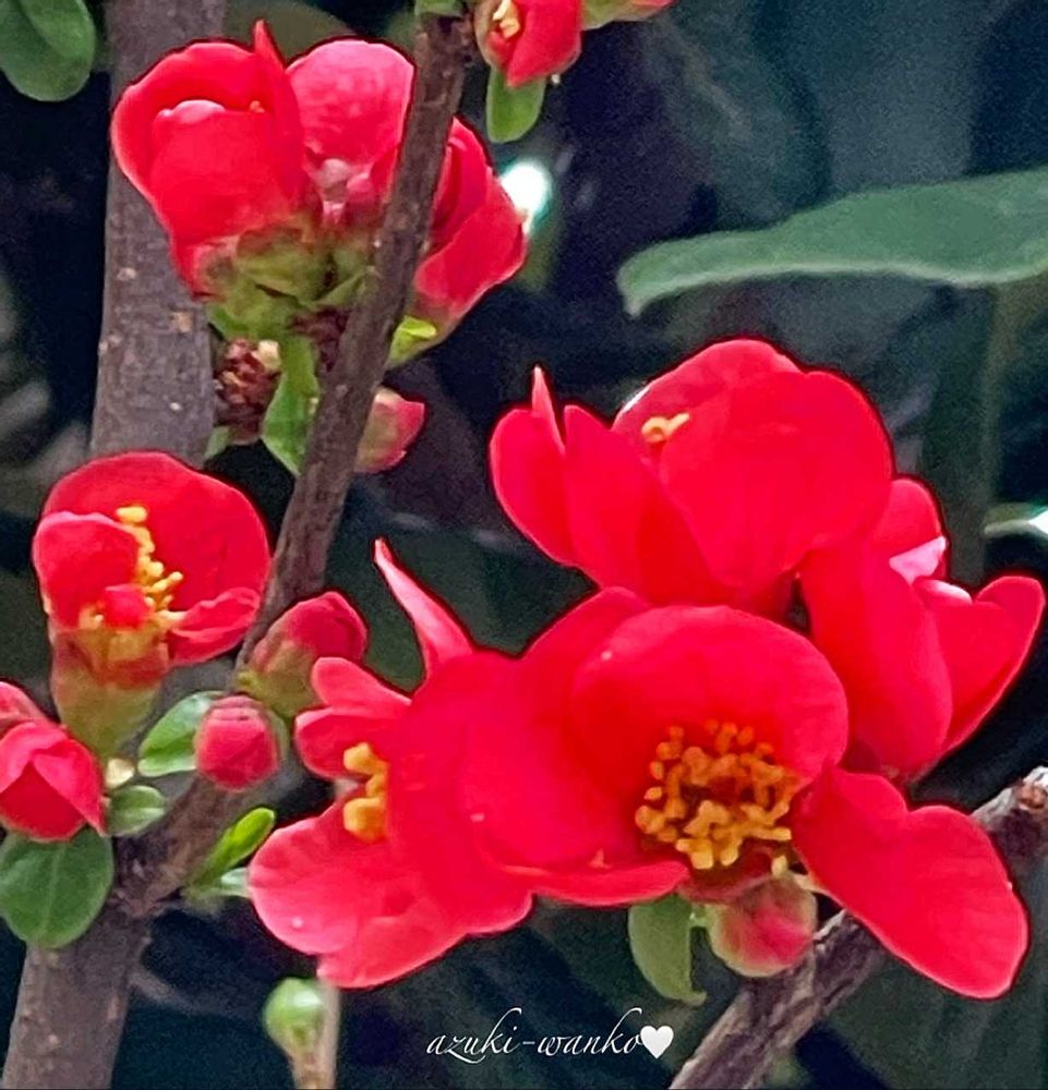 真っ赤なボケのお花美しいですね~~~❤️💚❤️