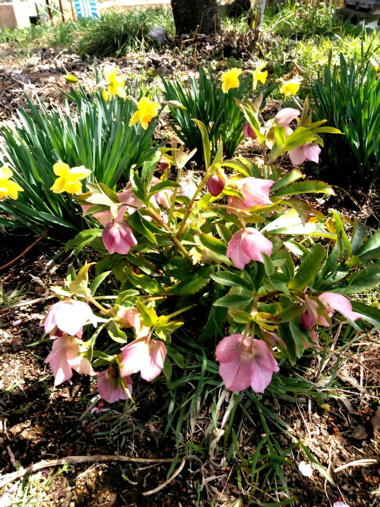 畑にはクリスマスローズやスイセンが陽をあびていました。青くて小さいお花が