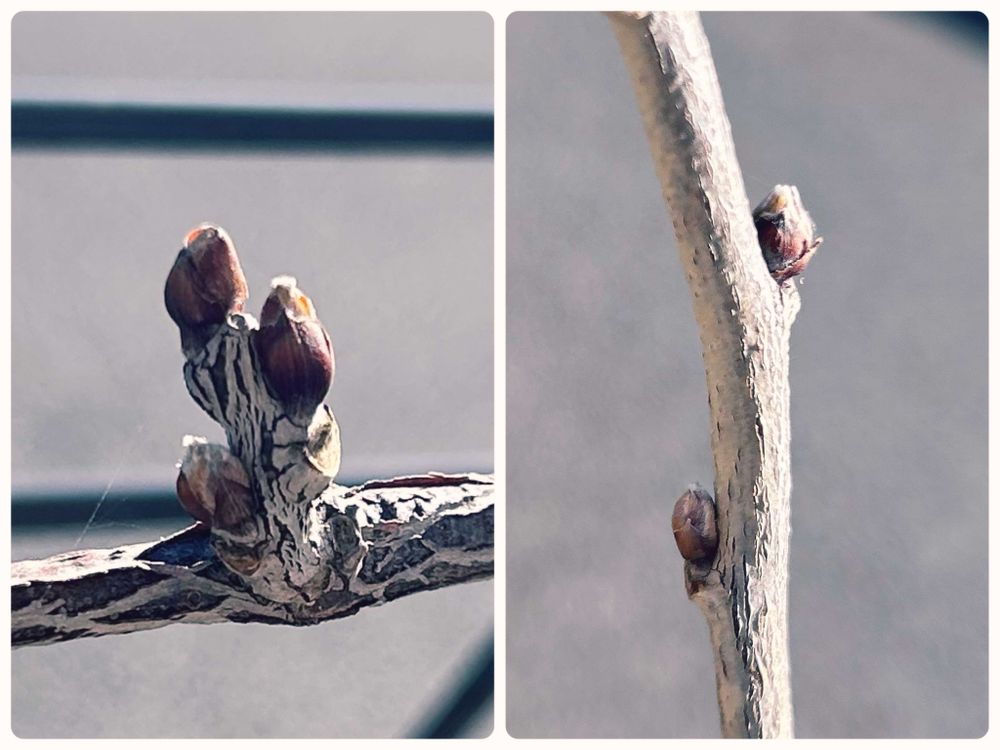 フジの実生、鉢植えです。丸3年経ち、初めて花芽のようなものがたくさんついています🌿フジについてはネットで調べても、なかなか咲かないとか、花がつくまで10年かかるとか、そういった情報ばかりで、でも植えなければ始まらないと長期戦も覚悟で育ててきました。野田藤かと思いましたが、もしかして一才藤?