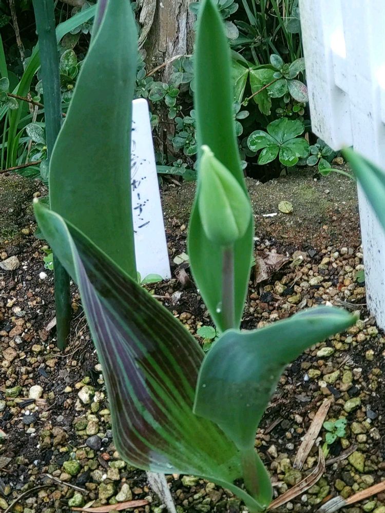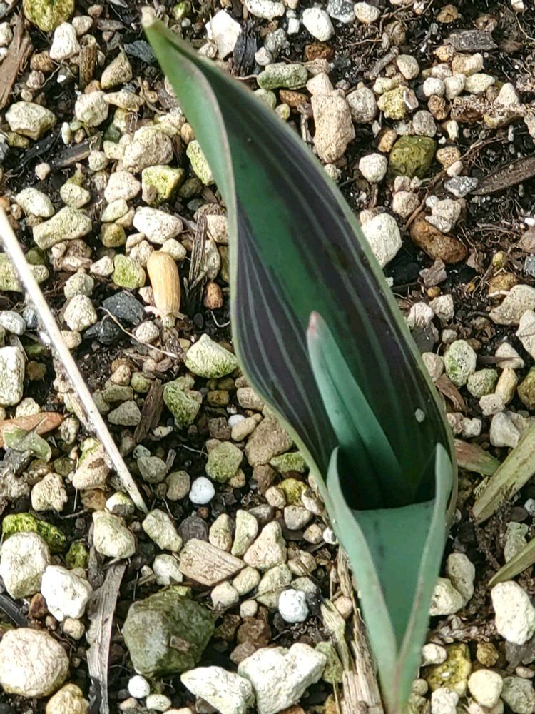 赤い筋の斑入り葉チューリップ🌷初めて見ました🙌新品種?